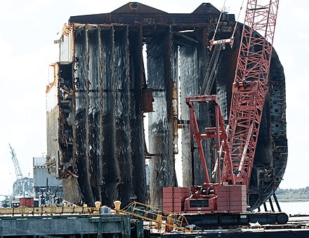 How did they do it? Basically, "chain-sawed" it, welded lift attachments before-hand, cut into 8 pieces of ~2,000 to ~4,500 tonnes each, put those pieces on other barges, and floated to recycling years (a remarkable video below ... 15 min. but fascinating if interested).