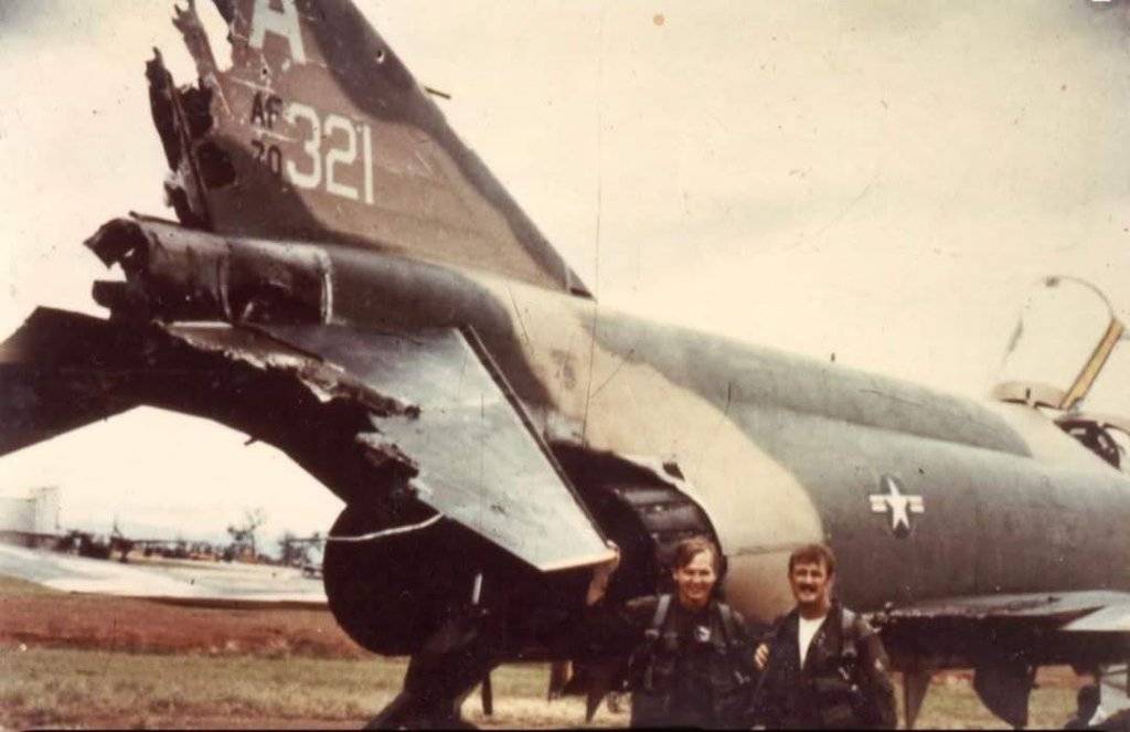 dunno context of this pic, but I infer from the plane's reputation, these fellas (or they are repairmen highlighting the beating the F4 could take and keep flying) flew/landed it with its a** nearly shot off.