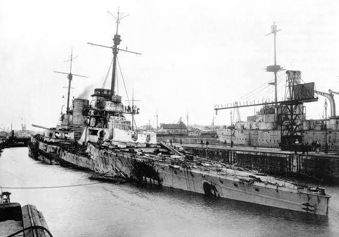 That hole in the side was made by a torpedo! That demonstrates how low in the water Seydlitz was sailing at the time it was hit. That ship took a beating at Jutland (Skaggerak), but did much better that many British ships that ceased to exist on that day! What was that Admiral Beattie said, "We have a serious problem with our ships today."