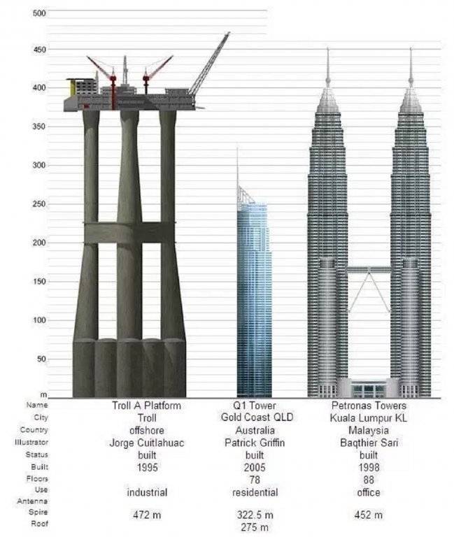 The Troll A platform has an overall height of 472 metres (1,549 ft), and weighs 683,600 tons (1.2 million tons with ballast). The platform stands on the sea floor 303 metres (994 feet) below the surface of the sea