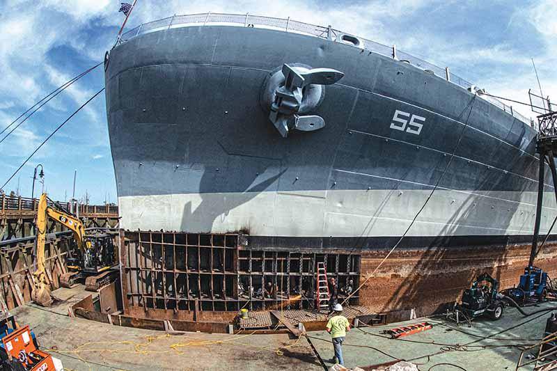 USS North Carolina (BB-55) getting hull repairs at her berth in Wilmington, NC. Posted in WilmingtonBiz Magazine, June 30, 2021.