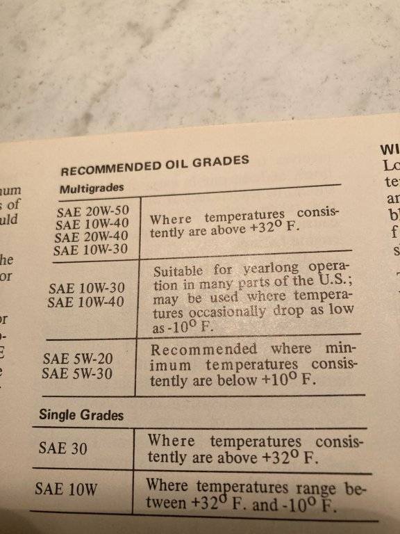I have found the most reliable information on the use of various oil viscosities comes from the vehicle owners manuals, and here is one example from a 1972 Polara/Monaco owners manual that is placed in the glove boxes at the factory: