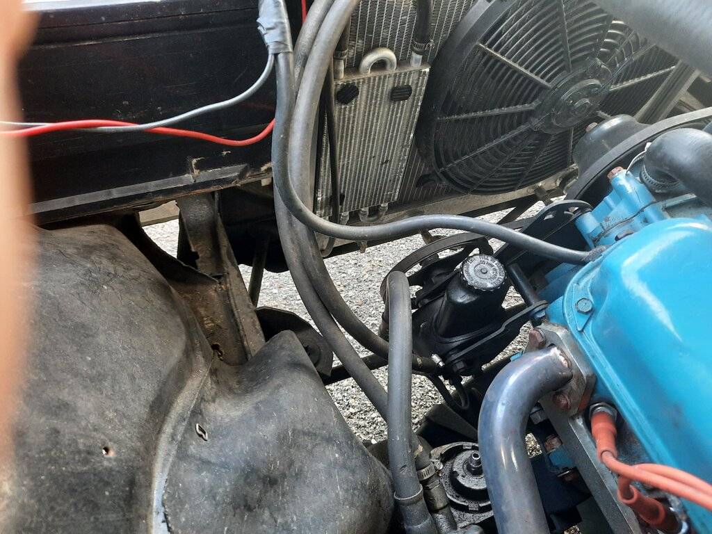 Note how the belt leaned back, actually rubbing the fan pulley! The OD green 5/8" high pressure hose with the brazed fitting reducing down to an 11/32" barb to complete the return hose into the reservoir clearly betrays how inappropriate the little pump was for this car. The red RTV on the edge of the reservoir did help hold in the fluid though! It didn't ever leak.