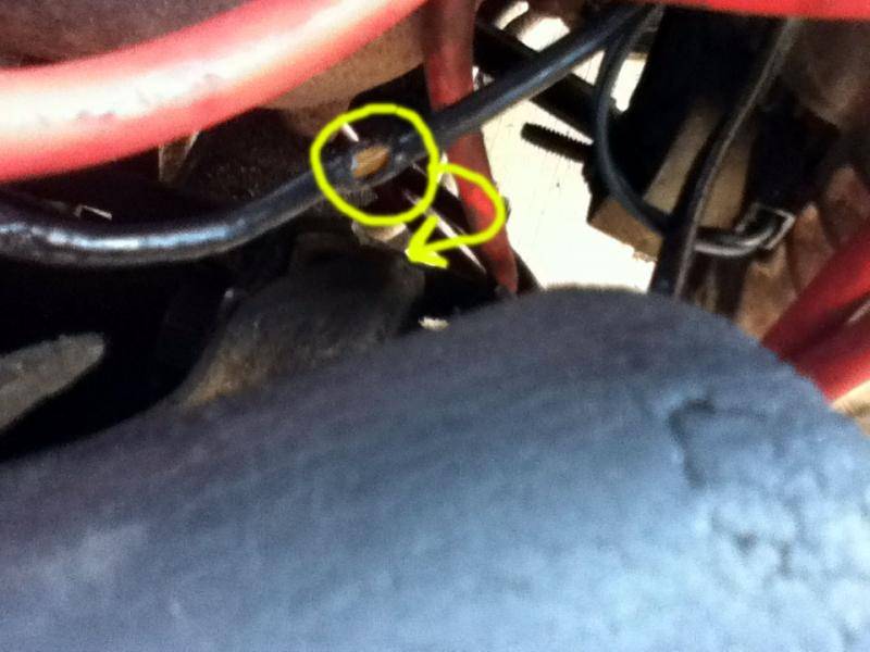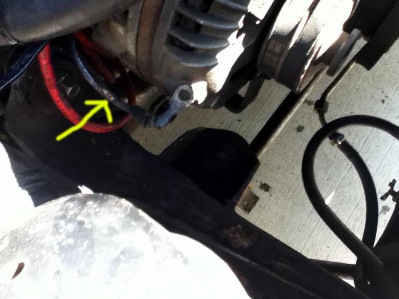 This is that large blk wire that terminates on the "bat" prong on the back of the alternator. Over time it have somehow got into the position where it was rubbing on part of the upper control arm; and the metal had actually worn away the sheathing. It was wide open and crusty with bare wire exposed and touching the control arm.