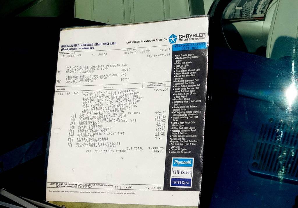 If that serial # is correct then the scheduled production date is way off. Vin should be 124xxx with a 919 SPD. Window stickerThis car totally blew me away. All original 1968 Hemi 4 speed convertible with an older (poor) repaint. You just don't see cars like this, even at Carlisle let alone a small town cruise in.