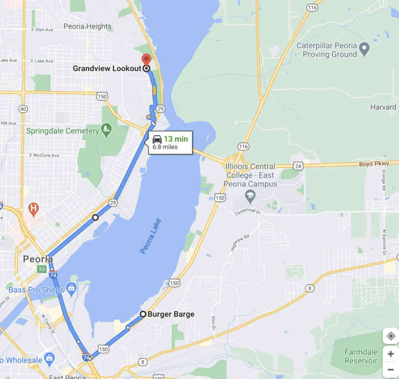 We'll meet at 11AM that Sunday on the parking lot of the SRSP Visitor Center in Oglesby (just east of Peru, IL). From there, we'll take first IL-71 west and then IL-26 south to drive down to the Burger Barge in East Peoria for a bite near the river around 1PM. That restaurant has parking and outside seating (my preference in general but especially important due to Covid), is well rated, and seems to be reasonably priced. An alternative would be one of the two eateries at the Peoria Station, but they are more expensive and for this reason were not my first choice.