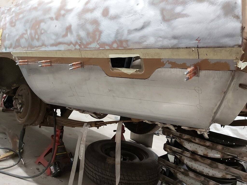 Right side quarter panel ready for welding and driver side I'm still working. Original panels used to have one water outlet but I think two is better than one! Btw..short "haired " wire brush is good lead remover...