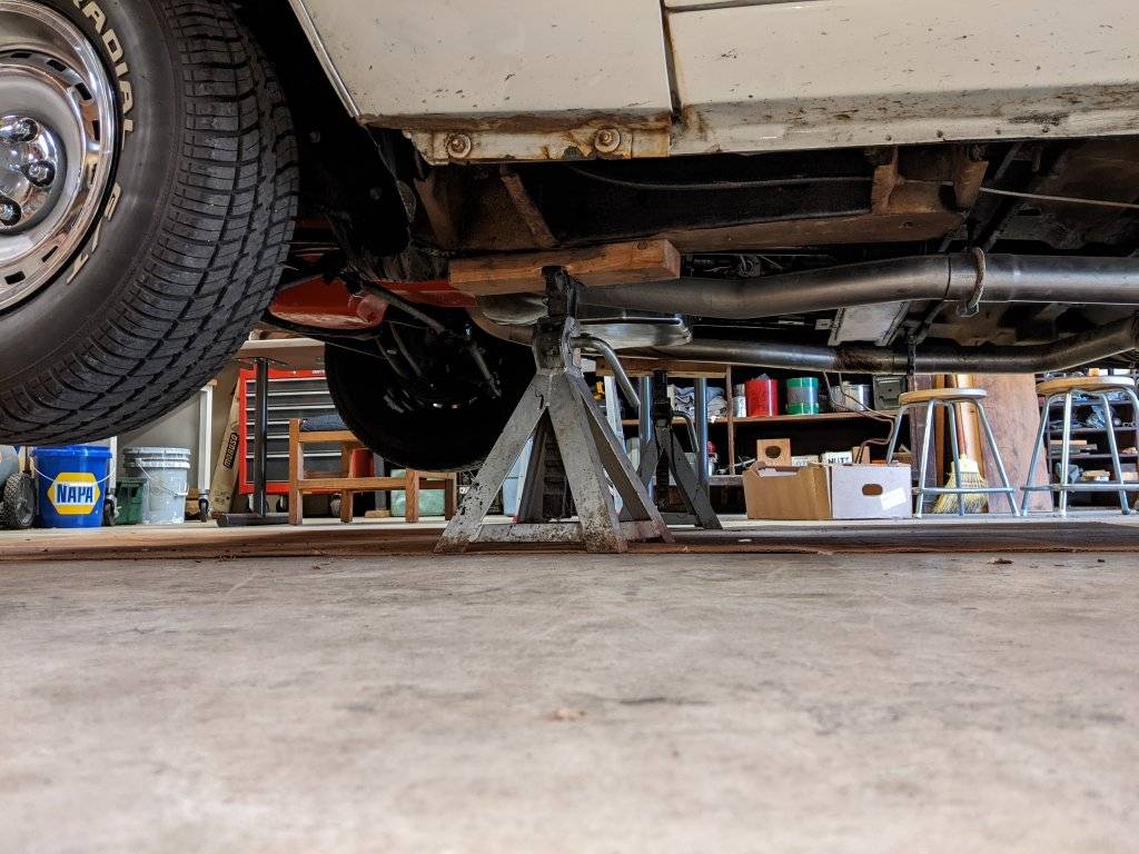 My Imperial rag is a big-assed car, weighing in at a hefty 5,440#. But, it IS a full-framed car, so I have advantages in jacking mine you guys with unibodies don't. I still jack that up from the center of the engine crossmember, put stands under the frame behind the wheels; and then jack up the rear from the axle center and support it at the front of the rear spring perches.