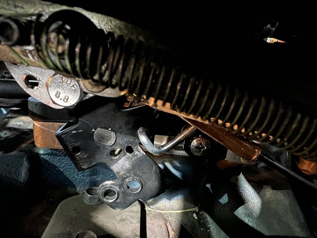 The original style linkage (silver link below throttle cable and cruise cable) set up shown above did not work with the air cleaner and cruise control in place due to interference. This link was just bent to 90 degrees at the same bend point and moved to the next hole up.