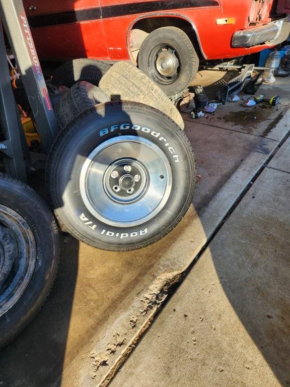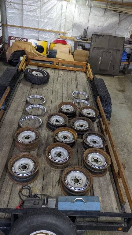 Looks kinda like the pile of wheels I have. Out of a "dozen" found 4 that were true with no variations while naked on a tire machine. Now comes the part of cleaning, repainting, and polishing. Found a couple that were 15 X 7, along with decent looking trim rings for the wider wheels.