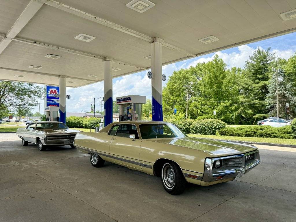 Below is a photo of Buttercup and David's 1970 Chrysler 300 Hurst at a gas station near his place, before my drive. The two cars will be caravanning this Friday starting mid-afternoon with