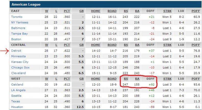Detroit still leads the AL in WP and has the largest Div lead but take note of the A's in the West and that run differential ! They are belting them in and the pitching and defense is miserly .. great combination