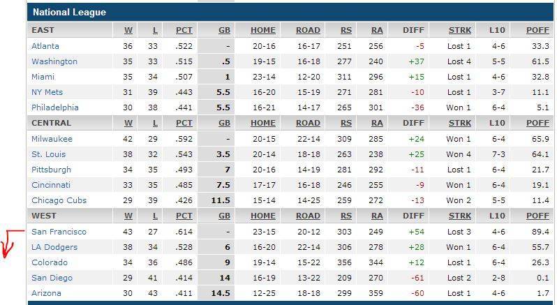 Pretty close in the NL although the Gigantes have the best record in baseball .. for the present anyway