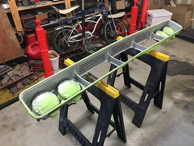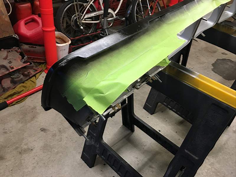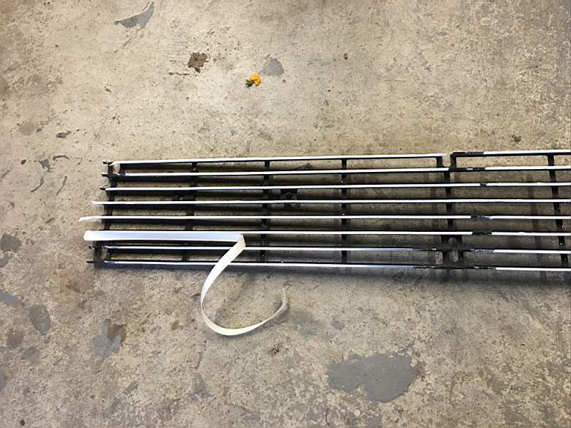 The next item I needed to improve was the grill. The push bar needed to be removed first and then the grill. With the grill off I removed the finish panel and polished the edges of the fins then masked them off, although it was an anodized part I painted it. On the housing I masked the chrome off and painted the silver, after a few coats I changed the masking and did some blackout.