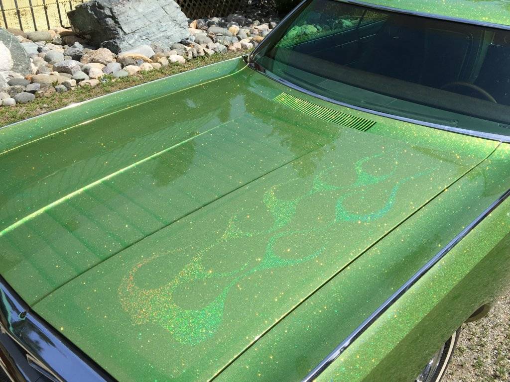 I removed all the side mouldings and emblems, added 1970 300 grille, taillights and side mirror, painted it with Roth Sublime metal flake with 70's style fading, lace, flames, fish scales etc in Alsa candy. The wheels are Supremes.