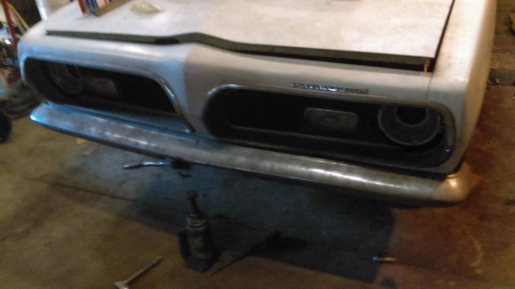Yes still on hinges and springs, hard to find a 69cuda/73-4 dart one piece fiberglas, thought about converting to a 67-68 flat nose grill shell but never happened.