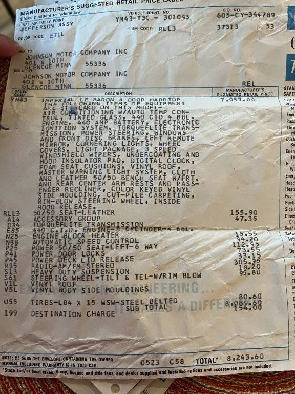 Back in September I had a FB Marketplace 4-door LeBaron shipped from Maine to me in Indiana. Original Burnished Red Metallic paint, quite worn in places and surface rust in others, Champagne top, and interior in Parchment. Has its original window sticker and other paperwork, sold at Johnson Motors in Glencoe, Minn., in June 1973. I believe I'm the 4th owner, and possibly the youngest.