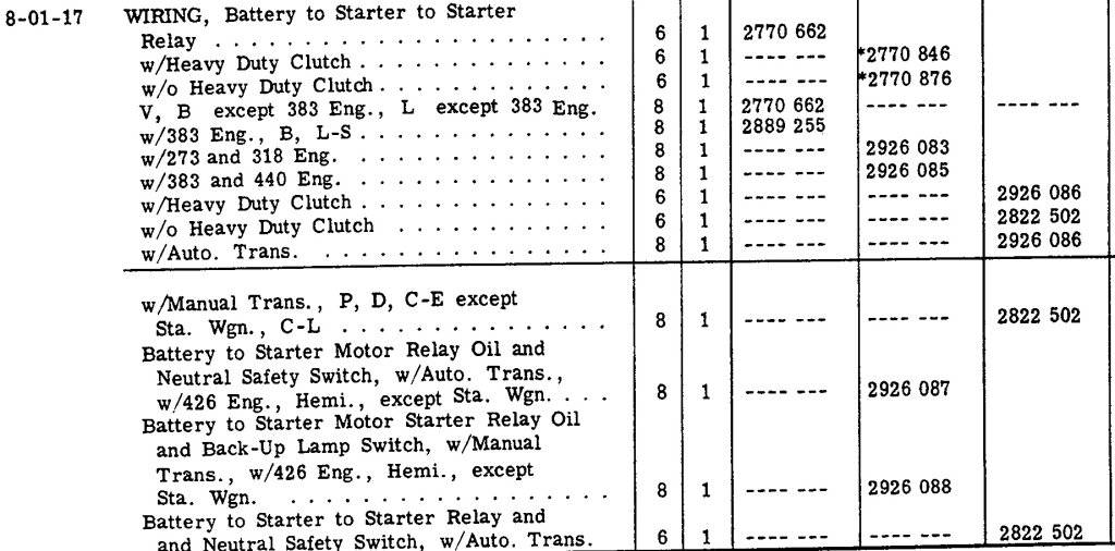 IF anyone has a measurement for the positive cable on a '68 Fury with a 318 from the battery positive post to the starter (yes, I'm aware of the relay cable from the positive post and the switch cable from the relay to the starter that are bundled with the battery to starter) that would be great. IF not, no worries.