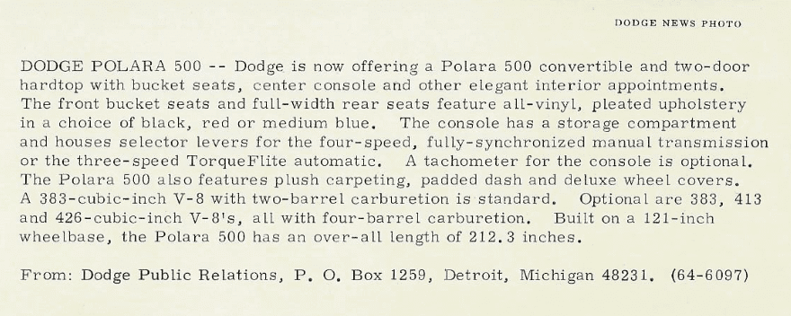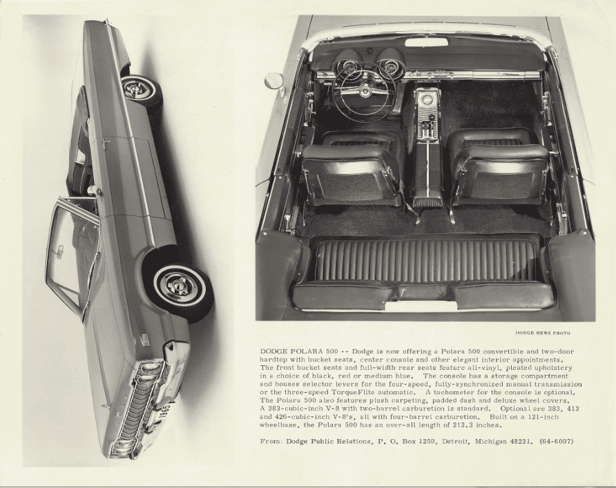 Cleaning house a bit and came across this one so I thought I'd share this about the Polara 500.Nice car indeed, and look at that console, I am sure that's a rare option.