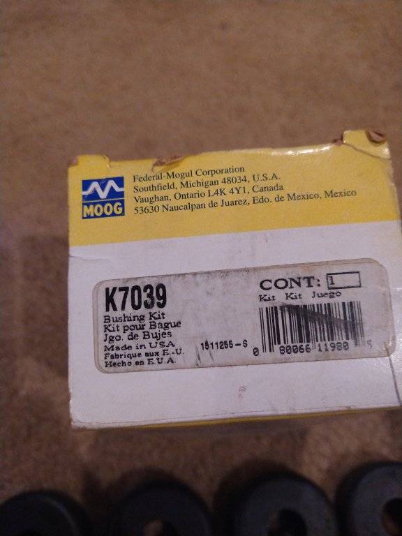 I have two brand new Moog strut rod bushing sets. Each box contains 4 washers and 4 rubber bushings. Part # k7039, looks like they will fit 57-64 300 and New Yorker, 57-66 imperial. They may fit others so please check the part number against your application. $15 each plus shipping from 40165. Thanks