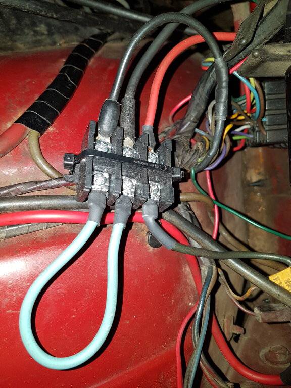 As well, I eliminated the two 10 ga wires going to the amp gauge from running through the bulkhead - and instead ran them as unbroken 10 ga wires through a firewall grommet. I added a multi terminal junction box (NOT a common strip bus bar), and terminated each of the two wires at their own junction block, and then added a fusible link to each one by running the fusible link to another terminal, and then the original wires continued from there to their destinations - the black one runs to the alternator, and the red one to the battery stud on the starter relay, through the original fusible link.