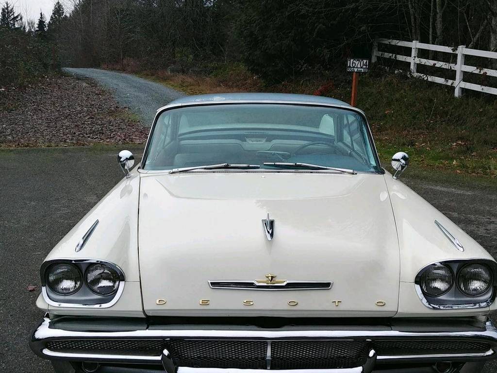 This 1958 DeSoto Fireflite 2-door Hardtop Coupe is an attention-getter. Large, distinct, and luxurious. Finished in two-tone Pearl White & Wedgewood Blue. Powered by a poly 361-cid V-8 with 305 hp and a 3-speed pushbutton automatic transmission. Exterior of the car was repainted in 1995. The interior sports the original blue and white vinyl seats, carpet and headliner and all are in excellent condition. Equiped with power windows and seats, all operational. With exception to the fuel gauge and radio, all instruments work. Trunk photo shows the existing original cracked rubber liner. Pampered and always garaged, this car is in excellent condition, has no rust and drives great. Clean title. 72,570 miles are shown on the 5-digit odometer, but true mileage is unknown. Shipping within the continental United States is included.