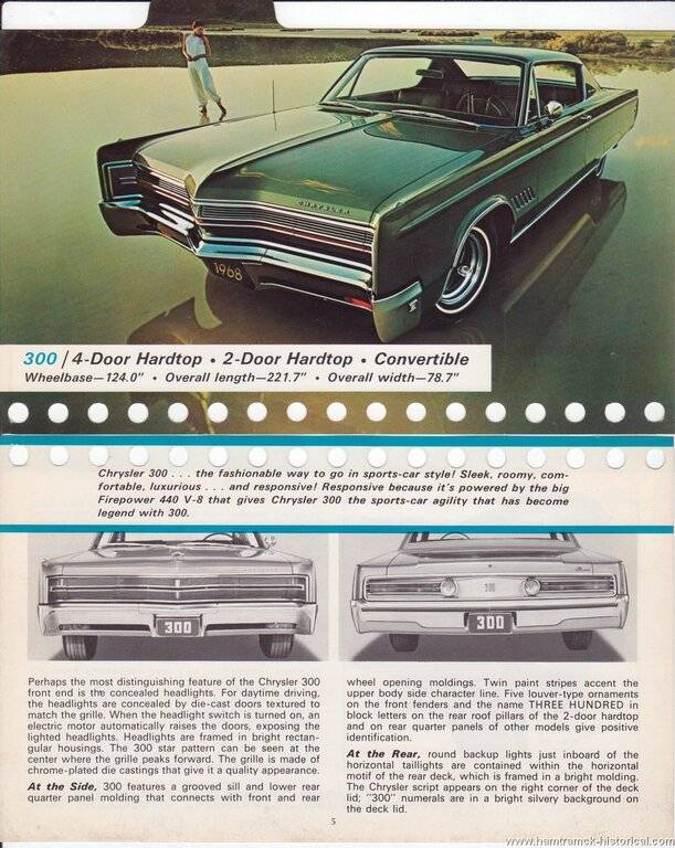 1968 Chrysler 300. 440 727 trans. Power seats flip-up headlights. Minor body damage left side. West coast car only rust is back window driprail. 3rd owner runs and drives brand new car cover.