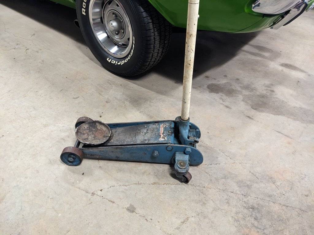 Sears floor jack purchased in 1977, but I repainted it Chrysler engine blue in the 90s. Time for another repaint...