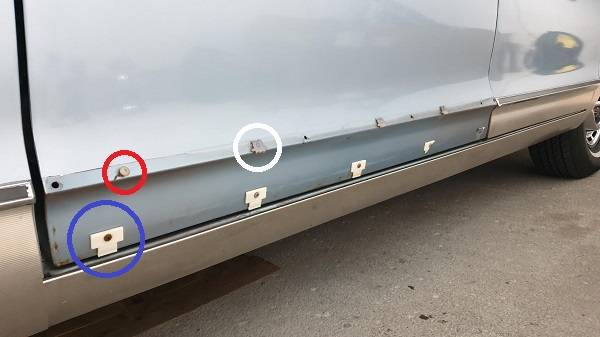 While I was reverse engineering the Sentinel photocell (now that I have put the cap back on, any tree on the street makes the lights to come on due to lack of light, even if it's bright sun outside...), my right foot touched the lower outer aluminum panel trim of the driver's door, and I noticed it was loose. After removing it, no doubt about the root cause, 2 out of 5 clips are broken. Any chance that the '65 would have the same ones? If so, I'll take as many as possible from it (the ones in the blue, white and red circles, but the broken ones are in the blue circles). So, I checked the other trim pieces around the car, and I have serious doubts on the retainers on the right lower quarter trim: screws were put through the trim (highlighted in yellow) - I have a new trim piece, which was supposed to have the retainers, but it seems I can't find them right now - I'll continue searching, but some extra ones won't hurt.
