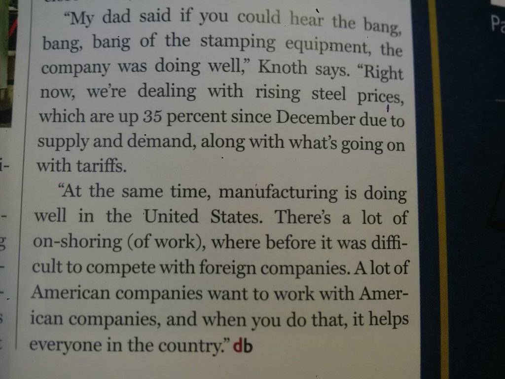 When I read the owner of a company talking about on-shoring and finally being able to compete (therefore provide good jobs) despite tariffs and due to strong demand, I know someone in the Federal government has done the right thing.