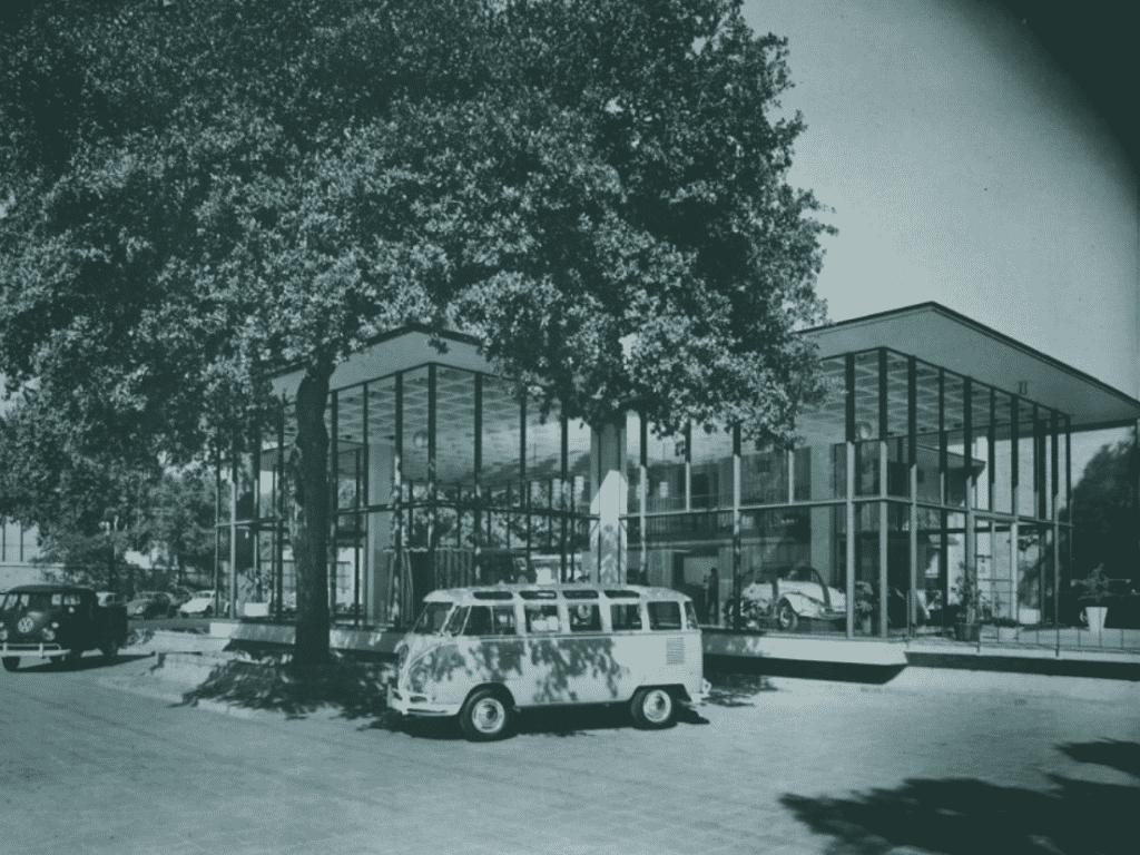 Former Intercontinental Motors Volkswagen dealership, mid-century modern (showroom), basic brick service area (still moderne design themes) behind showroom ,