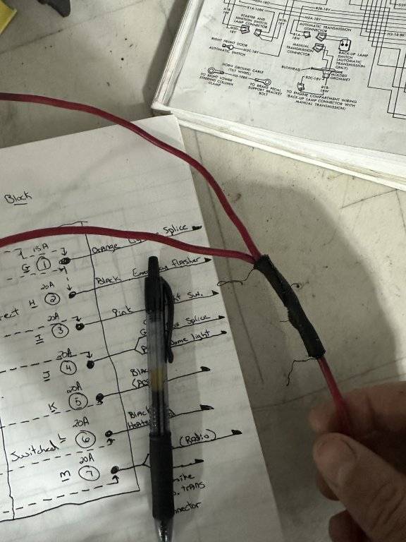 It’s a 68 300 2dr HT. Pic 1 is red out of bulkhead (A1-12R). Then it splices. One goes to the ammeter (A1A-12R). A1B-12R to accessory circuit breaker is the one in question. New fuse block red wire goes to ignition switch through a splice which also goes to headlight switch circuit breaker (red), auto transmission connector (black). These were taken and tagged directly from the old fuse block. The only thing I can honestly think of is that the wire in question is a main battery feed. But to where? The fuse block as well? Then out to supply the ignition switch? I don’t want full resto, I just do NOT want to burn the car down.