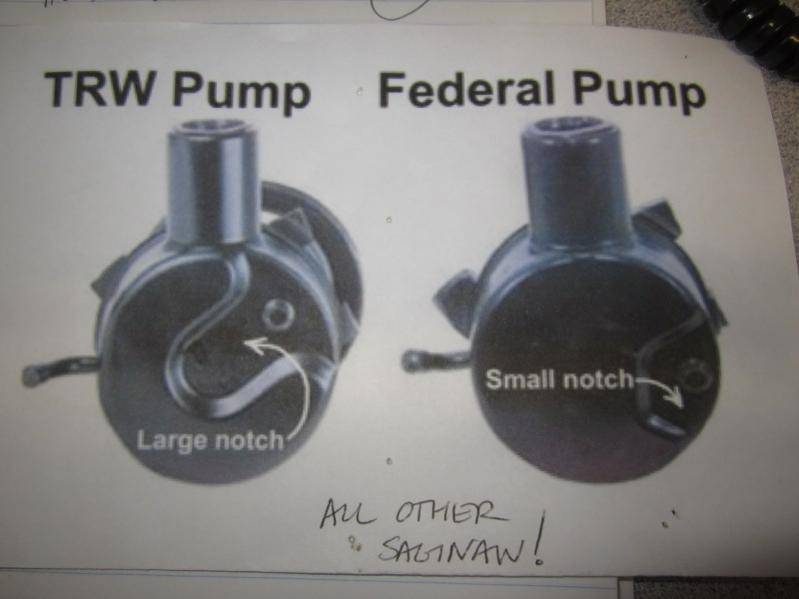O.K. All you PSP Guruz Herez my prefaced question. I have 3-4 PSPz floating around in my stash and I have no clue how to tell the difference 'tween Saginaw, TRW, and Federal. My local Carquest shipped my original pump off several yearz for a rebuild and all waz well. However, on the return trip from Carlisle ah while back The whole A$$ end of the Batwagon wound up with a fine oil mist on it. It ain't the trans or cooling linez, not the oil pan either. The pulley shaft has a slight oil film around it and the reservoir waz ah tad low so AH-HA, me thinkest culprate found. To the question: How do I pick out a Sagenaw pump IF THERE IZ ONE IN THE STASH? Jer(I'm not worried 'bout line fitting differences, Got ah guy in Ann Arbor that'll make me anything I want)