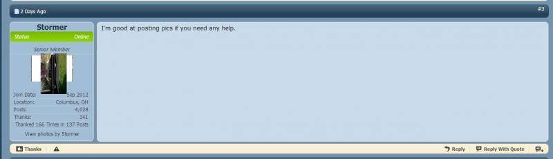 Jan 8, 2014 #3 Stormer Old Man with a Hat FCBO Gold Member Joined Sep 4, 2012 Messages 6,968 Reaction score 1,774 Location Columbus, OH I'm good at posting pics if you need any help.