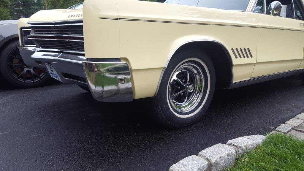 I've seen your car "in person" and it's gorgeous! Even better (if possible!) with the Mag 5's on it. It looks like the factory brochure photo! "You done good!" The '68 300s are classy cars and with the mags, for me, it's over-the-top in looks! The yellow shows beautifully! I have the optional road covers on mine and if you want to think about how times have changed, back in 1974 when mom and dad gave me their '68 300, I had a distaste for the standard factory hub caps; I found a set of 4 optional sport road wheels and for $12 I bought them ( I was making $1.95/hour in high school) and my dad, rest his soul, yelled that I paid way too much!! Now, I've seen them for $100 per cover.....times have changed!View attachment 308074 View attachment 308070 View attachment 308071 Just had Magnum 500 wheels mounted on the '68 300. There have been more than several posts on here questioning what size to use. In '68 you either had 14 X 51/2 inch wheels with drum brakes or 15 X 6 inch wheels with disc brakes. I know some have discussed going taller and wider. I chose 15 X 6 wheels to stay with a size that was offered at the time, and to keep the stance/wheel well set back as would have been from the factory.