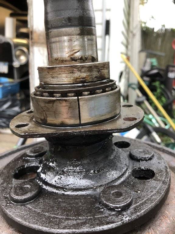 Wow! Never saw that happen!I adjusted the bearings and it seemed to take up a lot of play in the bearings. I took out the right side first and the left side. I cleaned them and looked at them and they seem to look ok but I did see a cut in the bearing race on the left side.