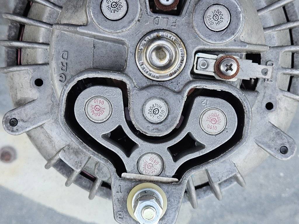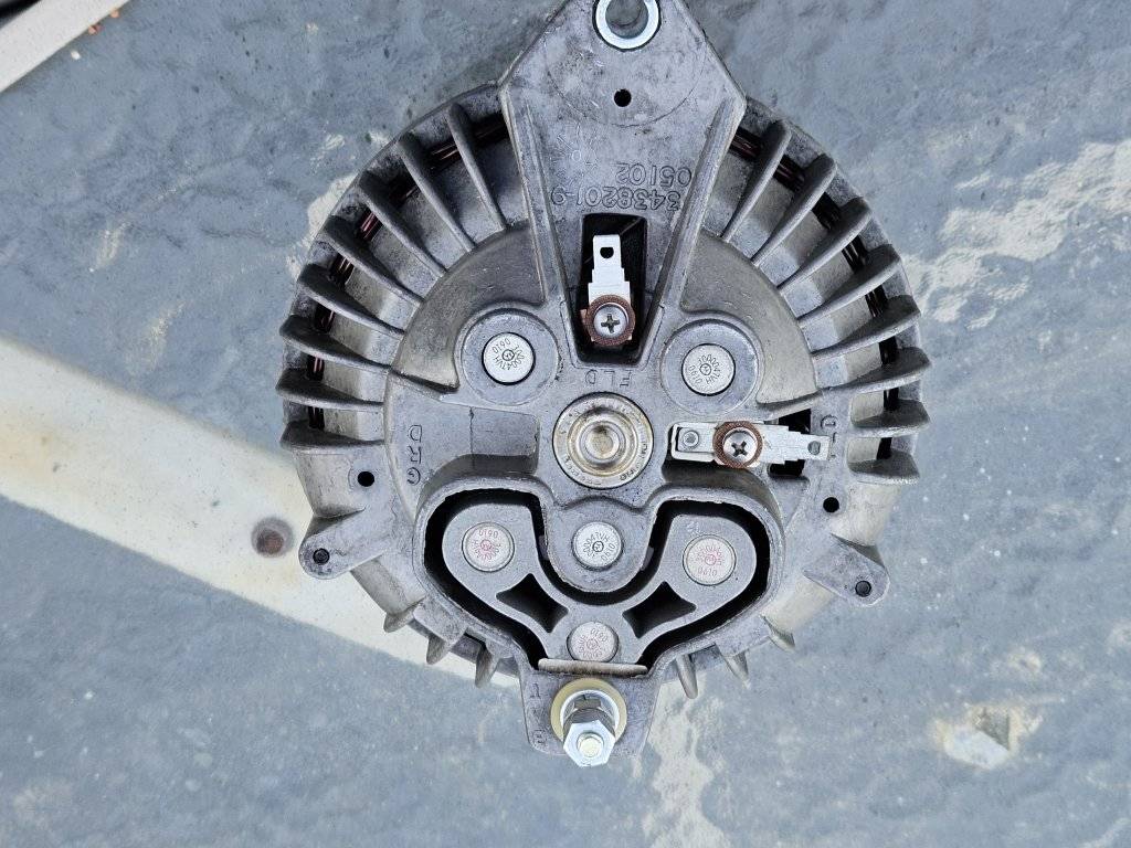 Rebuilt 3438171 Alternator dated 14 70. the part number is correct for 70 and 71 slant 6 vehicles, but all the parts are the same as the 3438172 used on all V8's without AC. There is no paint on the cases, cleaned and treated with Boeshiled. With the stator and diodes installed it will deliver 50 A.