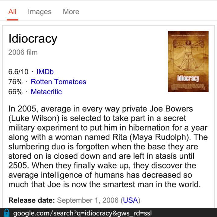 I didn't think much about that movie at first... but it has become a little too satiric of our world.You really need to see "Idiocracy". It is the future.