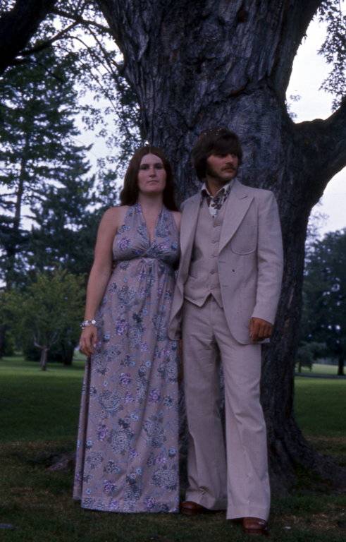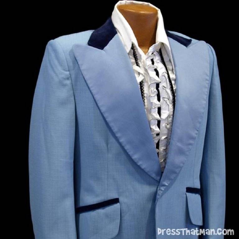 I cannot put mine up .. way too embarassing. My prom tux was like this .., about this color blue, nearly shoulder to shoulder wide lapels, huge bell bottoms, chest and sleeve ruffles to an outrageous degree .. and platform shoes