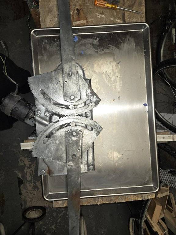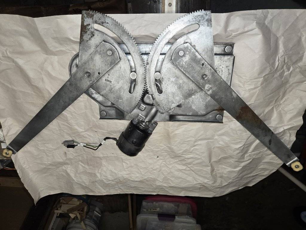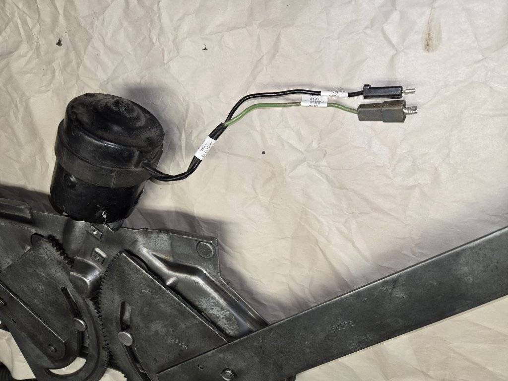 Rear window regulator is finished. Final push was cleaning the crude out between the base and lift arms. Settled on a combination of flooding the pivot points with cleaner and wipping it out with coarse twine doubled over and working it like floss, paper towel and a ripped d own piece of wood and working the arms up and down. After the wire brushing, Krylon solvent base mate clear was applied. Final touch was making wire labels for the input wires to the motor, a reminder of the negative lead goes to chassis and the leads swap between window up/ down. Need to find the white lithium grease and lube the friction points.