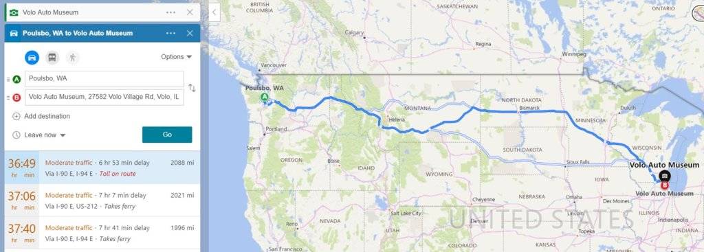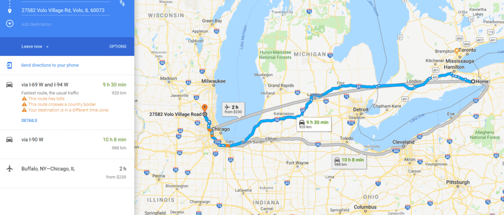 Considering the drive through Chicago I still call it even.Detroit to Volo=5 1/2 hrs / 330 miles