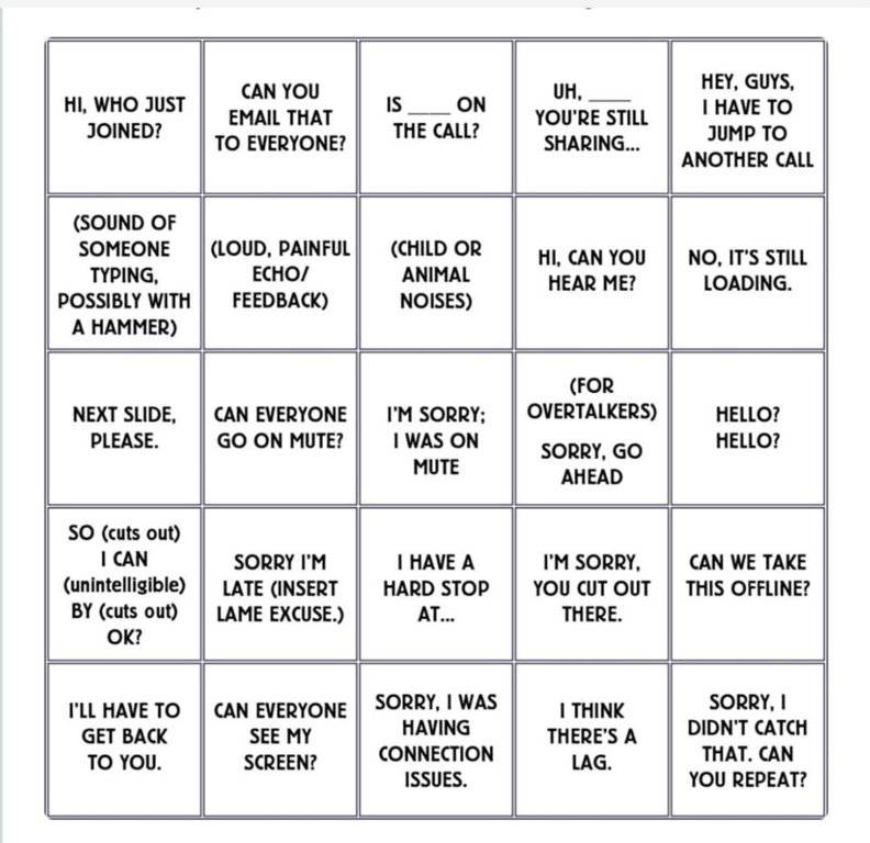 For those of you that are working from home and using online meetings. Here is a work from home Bingo Card.