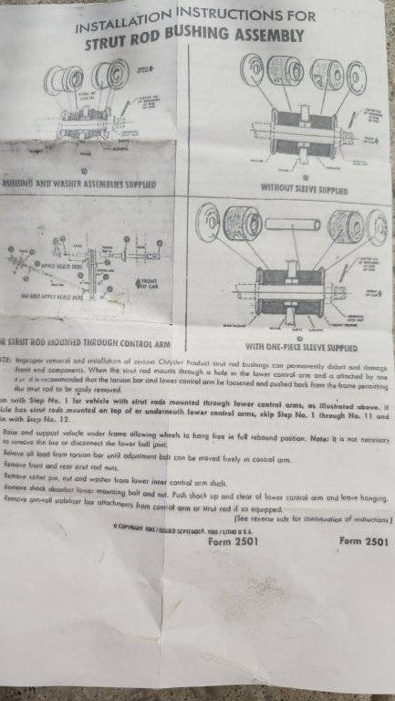 Out of curiosity - your '66 Chrysler, was it sold as a Canadian car? Does your stub frame have the rear torsion bar socket extensions for 47 inch torsion bars? If it does not, if you have 44 inch torsion bars, then you have a Fury stub frame. Canadian '66 C-bodies seemed to have those. Or maybe I'm confused and it was '65. I don't know if that would play a role in what the books say you need for the strut bushings.