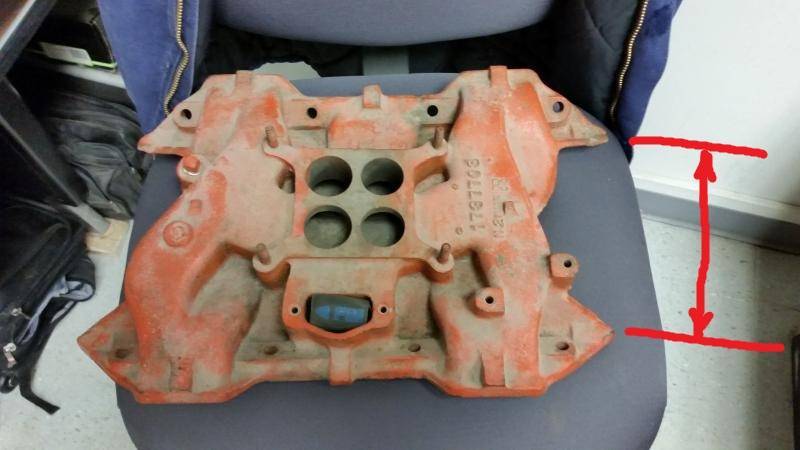 Here's an old pic of my Mopar M1 Intake Manifold. This one fits the B Engine (383 & 400 cid) Big Blocks. Sorry the pic is analog, but the width at the top edge of the mounting surface is approximately 12 1/4" as shown. A manifold for an RB engine should be around 1" or more wider than this. I hope this helps.