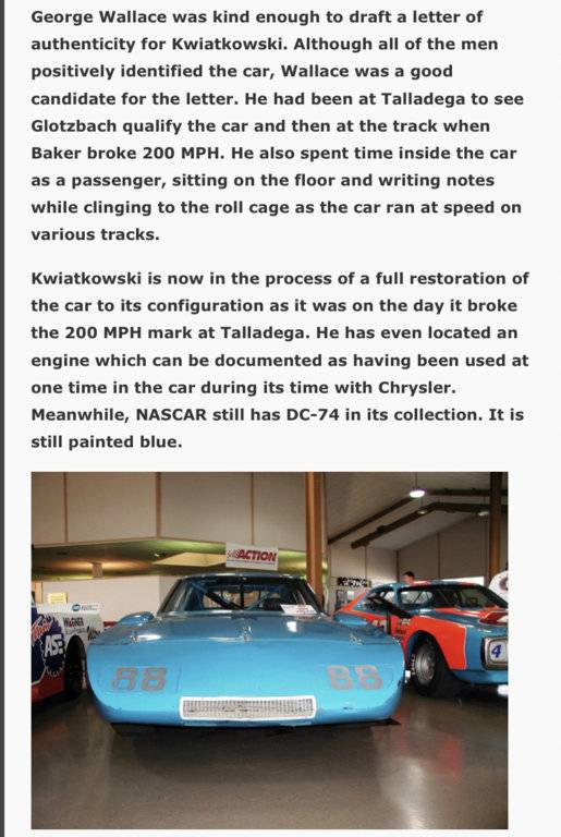 I had heard stories about the #88 Daytona being cobbled together for the Talladega museum and not being the original "mule" car. This story is the most in depth I've heard on the subject although I sense a little "embellishment" in the area of trying to "fool" Bill France. There are others min the museum that are actually "clones" but they are done well and display well.