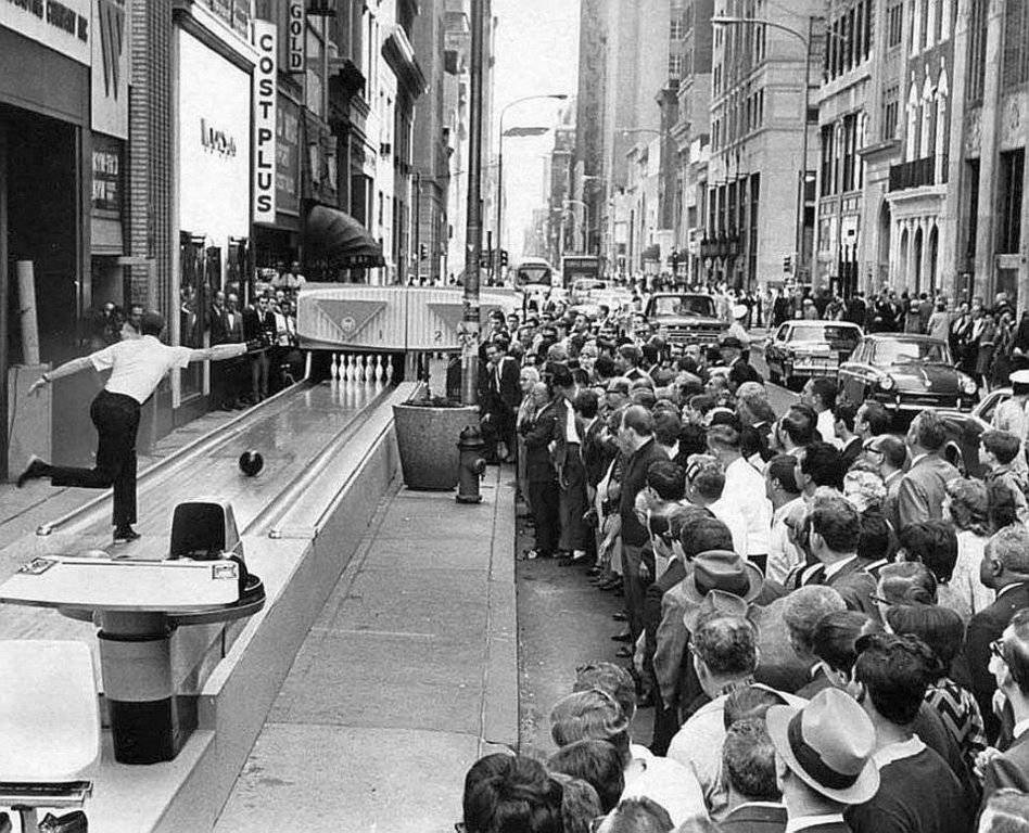 ImpJay said: What´s the story of that bowling track in front of Cost Plus? Thanks for posting these all! Click to expand... Champion bowler Dick Weber lets one go in for a strike while obliging passers-by outside studios of KYW-TV, at 16th and Walnut in Philly, September 1967.