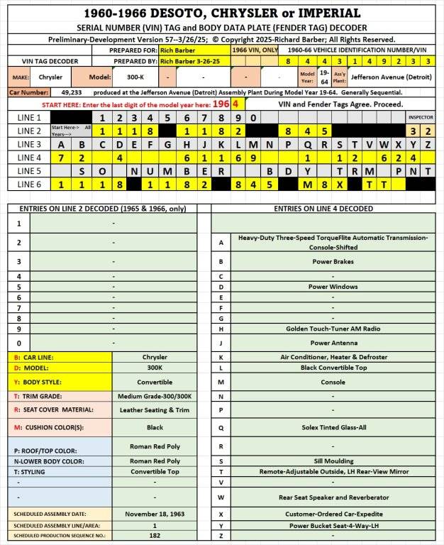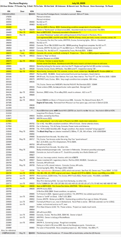 This is an update to the January 14, 2025 posting of the Registry. Yellow highlights are "new" information. We now have real info on 81 cars, about 17 percent of the 485 produced. Again, I have a list of about 280 VINs, but it's only VINs from a 300 Club list, no other information. Amazingly, our random Registry detective work has found 19 cars that are NOT in the 300 Club list.