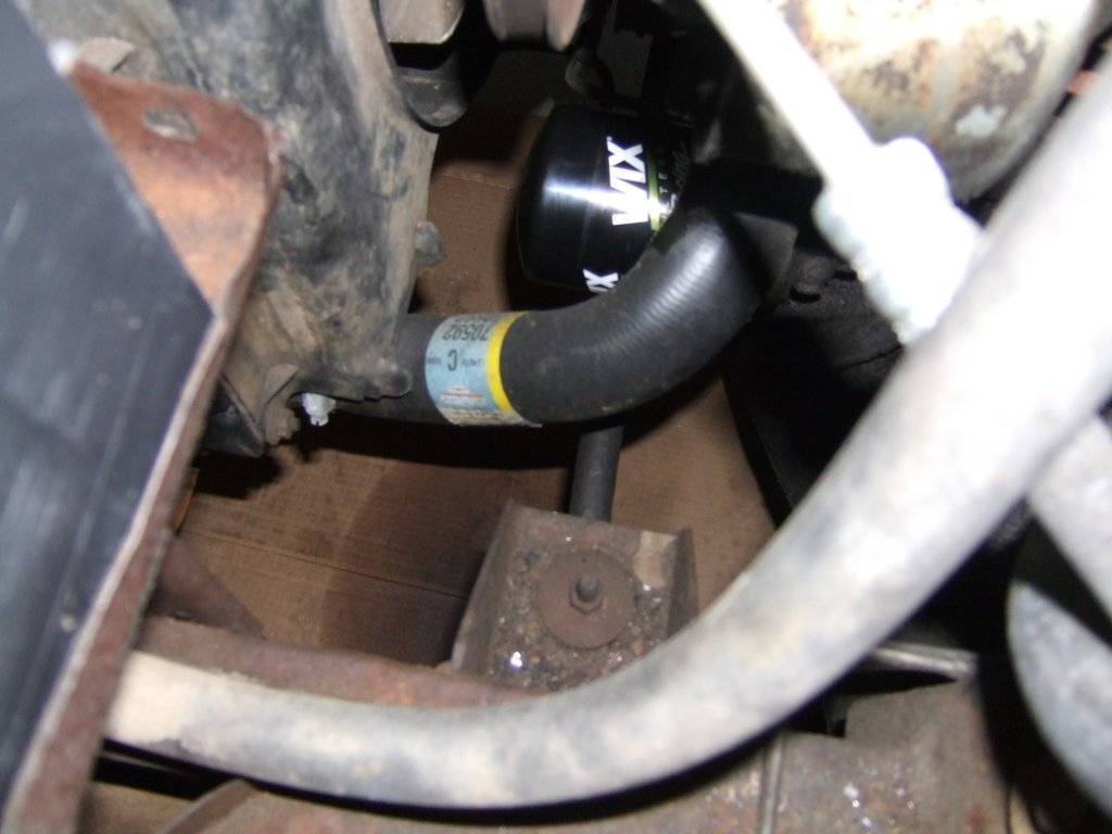 The next repair involved the leaking power steering pump reservoir. In the photo below, you can just barely see the leaked power steering fluid on the lower radiator hose just above the word: "WIX." From what I've read, this wet lower radiator hose is the hallmark of a bad reservoir-to-pump O-ring.