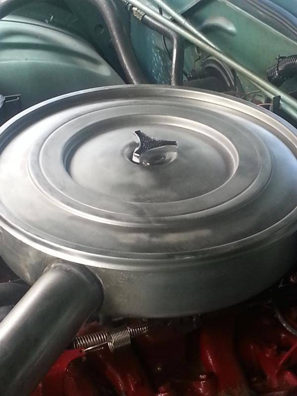 Did a few small jobs I've been meaning to do. First of all, as I described earlier, I've been thinking about what to do with the air cleaner assembly. The round chrome one in the early pictures is no longer. It got damaged and rusty during the hibernation period around my separation and divorce. The triangular Edelbrock never floated my boat, looked too small. I experimented with spray painting the original but I suck at little detail jobs. I just don't have the patience or the fine motor skills. The two attempts I made were terrible. Finally I decided to take it down to the metal. I used a power drill with a steel brush attachment and also a palm sander. Then I gave the whole thing a couple of coats of clear to keep the rust worm away. I'm pretty happy with the outcome. Has its imperfections but overall I'm pleased.