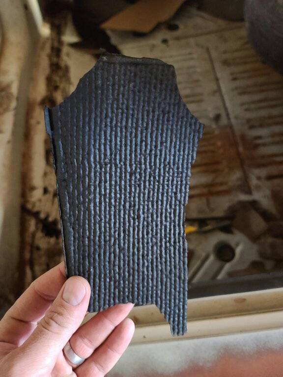 Our '66 Newport is similar. After a while,it became rock hard and brittle, being rubberized with a faux carpet texture. Now, to move it is to destroy it, so it's where it is.